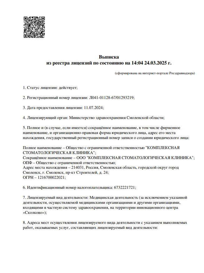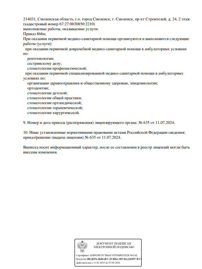 Проводит консультации, лечение кариеса, отбеливание зубов, профессиональную гигиену, лечение дёсен, реставрацию зубов, лечение каналов зубов, лечение под закисью азота, лечение под седацией, рентгенологию и КТ.